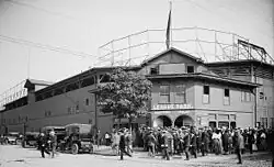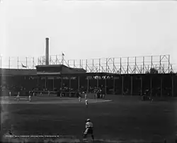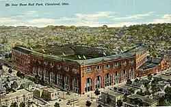 When it originally opened in 1891, it had 9,000 wooden seats.[9] A single deck grandstand was behind homeplate, a covered pavilion was along the first base line, and bleachers were located at various other places in the park. The ballpark was configured to fit into the Cleveland street grid, which contorted the dimensions into a rather odd rectangular shape by modern standards. The fence in left field was 385 feet (117 m), 460 feet (140 m) away in center, and 290 feet (88 m) down the right field foul line.[19] Batters had to hit the ball over a 40-foot (12 m) fence to get a home run (by comparison, the Green Monster at Fenway Park is 37 feet (11 m) high).[20]