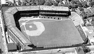 Batters still had to surmount a 40-foot (12 m) fence to hit home runs.[20] The fence in left field was only five feet tall, but batters had to hit the ball 375 feet (114 m) down the line to hit a home run, and it was fully 460 feet (140 m) to the scoreboard in the deepest part of center field. The diamond, situated in the northwest corner of the block, was slightly tilted counterclockwise, making right field not quite as easy a target as Baker Bowl's right field (which had a 60-foot (18 m) wall), for example.