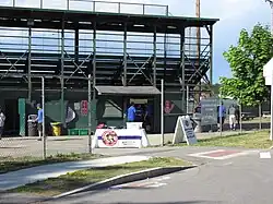 Leary Field has a covered wooden grandstand (pictured), aluminum seating on the third base side, and picnic space and accommodation for spectators in lawn chairs on the first base side. Beneath the grandstand is a concrete-block building housing toilets and food-service facilities. These open away from the field, behind the grandstand.