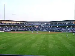Ground was broken on September 4, 2002, and was completed in just over nine months by Titan Construction, opening June 6, 2003. Baseball had a record paid attendance of 10,345 on June 23, 2007.[5] Major League Soccer attendance, with the updated seating configuration, regularly exceeded 8,000, and its record paid attendance was 10,385 on March 29, 2008. The 2006 Northern League All-Star game was held at CommunityAmerica Ballpark on July 18, with related festivities the day before. Sporting Kansas City played its home games at the stadium while the team's new stadium was being constructed. Because of the soccer presence, the Baseball configuration had taken an unusual step. In most natural grass fields the base lines where baserunners run between bases is dirt. However, CommunityAmerica Ballpark had dirt sliding pits just around the three bases, homeplate, and the pitchers mound, much like most typical artificial turf baseball fields. This was so that grounds crews would not need to install excessive amounts of grass for each Wizards home game. On March 29, 2008, the Wizards played their first game at the ballpark and defeated D.C. United 2–0 in front of a sell-out crowd.[6]