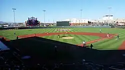 The stadium features an AstroTurf field.[10] Its capacity of 2,500 spectators consists of chairback seats, berm seating, and standing room. It has a press box, three private suites, a concourse, concession stands, and an electronic scoreboard and video board. Practice areas and player lounges were also built with the stadium.[5][11]