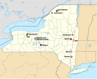 The league includes founding members Clarkson University, Hobart and William Smith Colleges, Rensselaer Polytechnic Institute, the University of Rochester, St. Lawrence University, Skidmore College, and Union College. Vassar College became a full member of the league during the 2000–01 academic year, Bard College and Rochester Institute of Technology joined for the 2011–12 academic year, and Ithaca College officially joined for the 2017–18 academic year. Founding member Hamilton College departed following the 2010–11 academic year in order to fully integrate its athletic programs within the New England Small College Athletic Conference (NESCAC).
