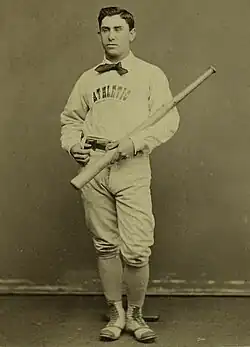 The Grays' first manager was left fielder Tom York.[1] York managed the team in 1878 and led them to a record of 33 wins and 27 losses. York also managed the Grays for part of the 1881 season, and in total managed the Grays for 96 games, with 56 wins and 37 losses, for a winning percentage of .602.[5] In their second season, the Grays were managed by shortstop and Baseball Hall of Fameer George Wright.[1] Wright led the team to a record of 59 wins and 25 losses for a winning percentage of .702 in 1879, winning the National League pennant.[1][6] Wright left the team to join the Boston Red Caps, managed by his brother Harry Wright in 1880.[6][7] In 1880 and 1881 the Grays employed a total of five different managers, including York's second term and 32 games managed by Hall of Famer John Montgomery Ward.[1][8]