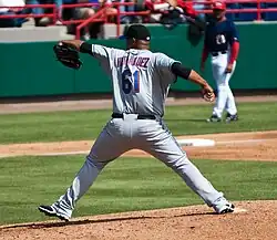 From 2003 to 2005, Hernández led the National League in innings pitched, and led the league in complete games 2003 and 2004.[6] In 2003, Hernández posted a 15–10 record and had a career-low 3.20 ERA in 33 starts. He threw 233+13 innings, including eight complete games, giving up just 225 hits and 57 walks, while recording 178 strikeouts (the seventh-most in the NL) and a career-high 6.87 K/9 ratio, and turned in 22 quality starts.[6][14] Hernández was particularly dominant in July, going 4–1 in six starts with a 1.80 ERA in 50 innings, throwing three complete games, striking out 43 and holding opponents to a .197 batting average.[15] This helped earn him the NL Pitcher of the Month Award (he also won the Player of the Week Award on July 13, after throwing back-to-back complete game victories and striking out 16.).[16] His most dominant stretch came from July 2 to September 5; Hernández recorded 13 consecutive quality starts, allowing two earned runs or less in 11 of those starts, and pitching at least seven innings in all but one of them.[15] He recorded a 9–2 record with a 1.54 ERA in 105 innings during this stretch, averaging over eight innings per start, while striking out 95 against just 24 walks and holding opponents to a .203 batting average.