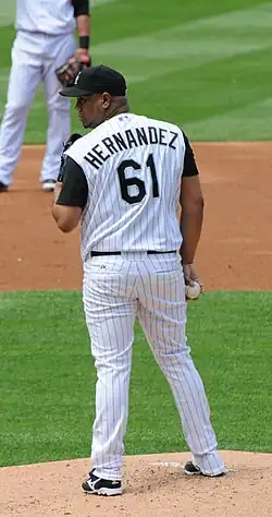 As a young man, Hernández had a fastball in the mid-90s, a slider, and a changeup.[54] As he aged, he became a finesse pitcher who relied on locating his pitches rather than generating great pitch speed.[55] His primary pitch was a sinker sitting at 83–87 mph. He also had a four-seam fastball in the same speed range. Another main pitch, used mostly against right-handed hitters, was a cut fastball at 79–82 mph. His off-speed offering to right-handers was a curveball ranging from 65 to 70 mph. Against lefties, he also added a changeup in the upper 70s.[56] His four-seam fastball was the slowest among all MLB starters in the 2011 season.[57]