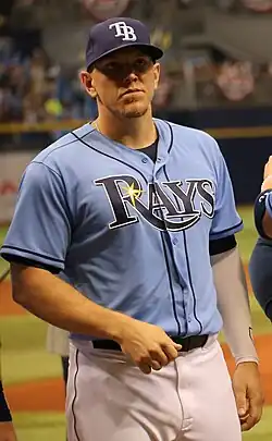 Morrison wore number 7 with the Rays. Having supplanted incumbent first baseman James Loney with a solid spring training, Morrison began 2016 with the lion's share of starts at first base, with utility man Steve Pearce as his platoon-mate.[25] He appeared in 107 games in his first season in Tampa Bay, making 78 starts at first base, and 17 as designated hitter. For the 2016 season he hit .238/.319/.414 with 14 home runs and 43 RBIs in 353 at bats, striking out in a career-high 22.4% of his plate appearances. Morrison played his final game of the season on September 11, as a torn left wrist sheath injury requiring surgery cut his season short.[26] Of the 95 starts he made, only 11 came against left-handed pitchers, and as a whole, Morrison hit .258 (16–62) against lefties while benefiting from a .341 BAbip, compared to his overall BAbip of .278. After the 2016 season, he became a free agent. On February 6, 2017, Morrison signed a one-year contract worth $2.5 million to remain with the Rays for the 2017 season.[27]