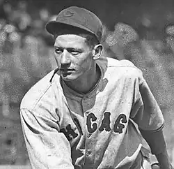 Warneke opened the season with five straight complete game victories,[13] helping the Cubs to a 17–6 first-place start to the season.[14] From mid-June to late July, Warneke ran off a nine-game winning streak,[13] all complete games, in a span of 44 Cubs games in which the rest of the pitching staff went 14–21.[15] On August 4, The Sporting News reported on its front page: "Warneke...is the sensation of the outfit, and there is as yet no indication that he is going to slow down."[16] That same day first baseman Charlie Grimm took over as the Cubs' manager, replacing player-manager Rogers Hornsby, whose record was 53–46; the Cubs were in second place, five games behind the Pittsburgh Pirates. On August 11, Warneke started, but did not win, a 3–2 extra inning victory in which the Cubs leapfrogged over the Pirates into first place,[17] where they remained for the last 47 games of the season.[15] The Cubs finished 37–18 under Grimm. Warneke went 5–1 with two shut outs and four no decisions down the stretch.[13]