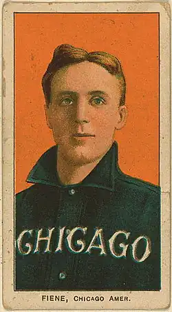 Fiene was then purchased by the White Sox. In spring training of 1906, he claimed to have mastered the spitball pitch.[4] He pitched in just six games that season, going 1–1, while Chicago won the World Series. Fiene didn't pitch much in 1907, either. He spent most of 1908 back in the American Association with the Minneapolis Millers, and he won 20 games.[3] That performance earned him a roster spot on the White Sox again. In 1909, he pitched a career-high 72 innings in the major leagues and went 2–5.[1]
