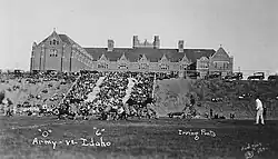 MacLean's football field was conventionally oriented north-south, with the west sideline approximately aligned with the Memorial Gym's tower.[8][9] In its early years, the grandstand on the east berm had limited seating, between the 40-yard-lines.[1] By the late 1920s,[8] permanent seating extended to the end zones and the west sideline had temporary seating along much of its length.[9] Prior to 1914, the football team played in north Moscow, at the southwest corner of Main and E streets.