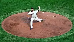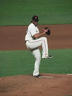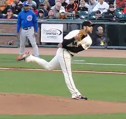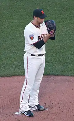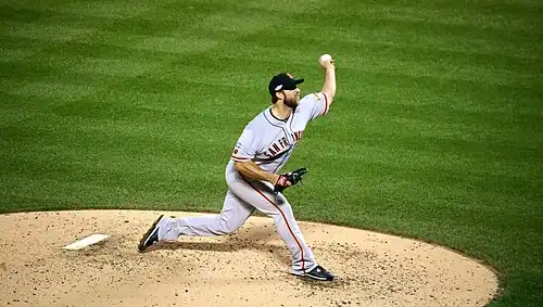 Madison Kyle Bumgarner (born August 1, 1989), nicknamed "MadBum",[1] is an American former professional baseball pitcher. He played in Major League Baseball (MLB) for the San Francisco Giants (2009–19) and Arizona Diamondbacks (2020–23). Bumgarner won three World Series championships (2010, 2012, 2014) and two Silver Slugger Awards (2014, 2015). He was also selected to four National League (NL) All-Star teams and has the most strikeouts in franchise history by a Giants left-handed pitcher.[2]
