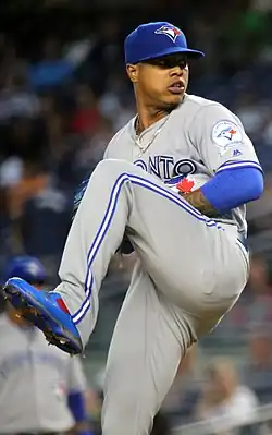 On March 23, 2016, Stroman was named the Opening Day starter for the Blue Jays.[58] He pitched into the ninth inning, holding the Tampa Bay Rays to three runs on six hits, while striking out 5 in a 5–3 win.[59] Stroman established a new career-high in strikeouts, with 9, in a 5–1 win over the Rays on May 1. He also set a Blue Jays franchise-record for strikeouts on a pitcher's birthday, surpassing David Price, Marc Rzepczynski, and Roy Halladay, who each had 8 strikeouts in starts on their birthdays.[60] Stroman improved on his single-game strikeout record on August 1, when he struck out 13 Houston Astros batters in a no-decision.[61] He finished the 2016 regular season with a 9–10 record, 4.37 ERA, and 166 strikeouts over a career-high 204 innings pitched.[40] He had the highest ground ball percentage among major league pitchers (60.1%), and the lowest fly ball percentage (20.4%).[62][63]