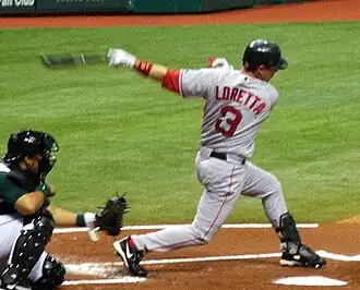 During the 2005 offseason, Loretta was traded to the Boston Red Sox in exchange for catcher Doug Mirabelli.[4] In 2006, Loretta hit .285 with five home runs and 59 RBI in 155 games with the Red Sox. Loretta was awarded a start at second base for the American League in the 2006 MLB All-Star Game. Due to various injuries to teammates, Loretta also filled in at first base and as the designated hitter at various points during the season. He hit his first career walk-off home run on April 17, 2006, against the Seattle Mariners on Patriots' Day at Fenway Park. This was also his first home run of the season.