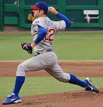 After nine starts in the minors, Prior was called up to the big leagues in 2002 as a 21-year-old.[5] He made his Major League debut on May 22 at Wrigley Field against the Pittsburgh Pirates and became one of 14 Cub pitchers since 1920 to win his first major league start by striking out 10 batters over six innings pitched in a 7–4 victory. Teammate Sammy Sosa said, "I was impressed with what he did today. Going out there in front of 40,000 people and throwing the way he did, that was a good sign."[15] On June 7, he threw 128 pitches and struck out 11 while allowing no runs in a 2–0 win over the Seattle Mariners.[16] He threw his first career complete game on August 4, striking out 13, allowing one run, and throwing 136 pitches in a 4–1 win over the Colorado Rockies. "I was kind of surprised that they did send me out there," he said, when he found out he was pitching the ninth.[17] On August 15, he struck out seven hitters in a row, tying the Cubs' record shared by Jamie Moyer and Kerry Wood. In total, he struck out 12 in six innings, earning a no decision in an eventual 6–4 win.[18] During a game against the St. Louis Cardinals on August 31, he was removed because of a strained left hamstring.[19] Two days later, the Cubs announced they were shutting him down for the rest of the year because of the injury.[20] Prior finished his rookie campaign with a 6–6 record with a 3.32 ERA, and 147 strikeouts in 116+2⁄3 innings pitched.[3] The Sporting News called his rookie season "stellar", and he finished seventh in National League (NL) Rookie of the Year Award voting.[3][21]