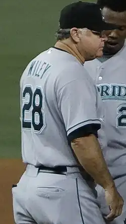 He left the Rockies' front office to become pitching coach for the Florida Marlins on November 9, 2004.[12] He was, however, fired after just one season, in which the Marlins went 83-79 with a 4.16 ERA.[13] He returned to his front office job with the Rockies for two years,[14] until returning to the Marlins' dugout for the 2008 season. He was fired at the end of the 2009 season despite the Marlins finishing twelve games about .500 with the lowest payroll in baseball.[15] He accepted the position of special assistant to Marlins General Manager Mike Hill until returning to the Rockies in 2012. On October 24, 2021, Wiley announced his retirement.[16]