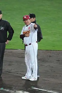 Masataka Nashida (Japanese:梨田 昌孝, born August 4, 1953, in Hamada, Shimane, Japan) is a former Nippon Professional Baseball catcher and manager. As a player, he played for the Kintetsu Buffaloes from 1972 to 1988. After playing, he went on to manage three NPB teams. First, Nashida was the final manager of the Osaka Kintetsu Buffaloes before they were dissolved and merged after the 2004 season. He then went on to manage the Hokkaido Nippon-Ham Fighters from 2008 to 2011. Finally, he went on to manage the Tohoku Rakuten Golden Eagles, the team created to fill the void left by the Buffaloes merger.[1] He was able to lead the Eagles to their third-ever playoff berth in 2017, however he resigned in July the next year when the club dropped to 20 games below a .500 winning percentage.[2] After his resignation, Eagles' coach Yosuke Hiraishi acted as team's interim manager for the remainder of the 2018 season.[3]