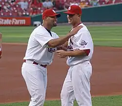 On July 24, 2009, the A's traded Holliday to the St. Louis Cardinals for prospects Brett Wallace, Clayton Mortensen and Shane Peterson[103] and $1.5 million.[104] He represented an instant offensive upgrade for the Cardinals in left field, where players had batted .212 with a .294 on-base percentage and a .342 slugging percentage in 2009.[105] He hit in the fourth slot in the lineup behind All-Star first baseman Albert Pujols.[106] Because Pujols already wore jersey number 5, the number Holliday wore with Colorado and Oakland, St. Louis issued Holliday the number 15.[105]