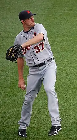 In Detroit, Scherzer grew from a hard thrower with control issues into an ace, teaming with fellow right-hander and future Cy Young Award-winner Justin Verlander to front the Tigers' starting rotation for five seasons.[26] A third-place finish in 2010 left them out of the playoffs, but was followed by four consecutive AL Central division championships.[27] The run culminated with Detroit winning the 2012 American League (AL) pennant, only to fall to the San Francisco Giants in the World Series.[28]