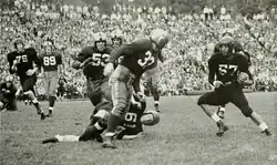 Groomes was also a member of the football team from 1944 to 1947. He was a third-stringer in 1944, but established himself as the team's starting wingback during the 1945 season.[8] Groomes and fellow African-American halfback George Taliaferro helped lead the 1945 Indiana team to the school's first-ever Big Ten Conference football championship.[9][10] In the first game of the 1945 Big Ten Conference schedule, Groomes had a 54-yard touchdown reception in a 13–7 upset over Michigan.[11]