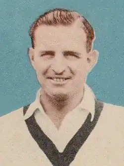 Barnes recovered and resumed his position for the Fifth Test.[42] Harvey ended his season by scoring 10 in his only innings of Victoria's second tour match against England, which was drawn, and was 3 not out in the first innings of the Shield match against South Australia when it was washed out. Harvey made his captaincy debut in the latter match as Lindsay Hassett was representing Australia in the Fifth Test, and his bowlers dismissed South Australia for 222 in Victoria's only innings in the field.[16][42] This washed-out drawn match was the only time in six Shield matches during the season that Victoria did not emerge victorious, and they won the competition.[43] Harvey ended the season with 405 runs at 33.75.[16]