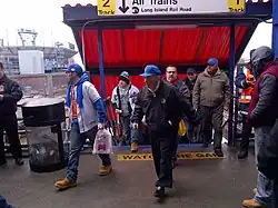 Fans streaming into the station following the conclusion of a September 2008 Mets game at the former Shea Stadium.