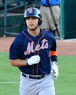 Conforto started the 2015 season with the St. Lucie Mets of the Class A-Advanced Florida State League, for whom he batted .283/.350/.462 (4th in the league) with 7 home runs and 28 RBIs in 206 at bats, and led the league with six intentional walks.[32] He was promoted to the Binghamton Mets of the Class AA Eastern League on June 26, 2015, for whom he batted .312/.396 (8th in the league)/.503 with 5 home runs and 26 RBIs in 197 at bats.[32] On July 12, 2015, at Great American Ball Park in Cincinnati, he started in left field for the United States team at the All-Star Futures Game and collected two hits and one assist.[33] He was named an FSL Mid-Season All Star, and to the 2015 Topps Rookie All-Star team.[31][34]