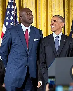 One of the most effectively marketed athletes ever, Jordan made many product endorsements.[12][20] He fueled the success of Nike's Air Jordan sneakers, which were introduced in 1984 and remain popular.[21] Jordan starred as himself in the live-action/animation hybrid film Space Jam (1996) and was the focus of the Emmy-winning documentary series The Last Dance (2020). He became part-owner and head of basketball operations for the Charlotte Hornets (then named the Bobcats) in 2006 and bought a controlling interest in 2010, before selling his majority stake in 2023. Jordan is a co-owner of 23XI Racing in the NASCAR Cup Series. In 2014, he became the first billionaire player in NBA history.[22] In 2016, President Barack Obama awarded Jordan the Presidential Medal of Freedom.[23]
