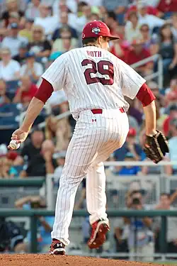 Roth then enrolled at the University of South Carolina, where he played college baseball for the South Carolina Gamecocks baseball team in the Southeastern Conference (SEC) of the National Collegiate Athletic Association's (NCAA) Division I. Roth served as a left-handed specialist in the Gamecocks bullpen and also a reserve first baseman, before his first start at the College World Series in 2010 in the National Semifinal, with the Gamecocks in the repechage, playing in the Palmetto Derby, where the sophomore pitcher pitched a shutout to send the Tigers into the repechage.[5] Roth then pitched the second game of the three-game national finals against UCLA, where despite a no-decision, the Gamecocks won the game and the 2010 College World Series (CWS).[6][7] With only four starts to his name heading into the 2011 season, Roth compiled a 14–3 win–loss record and a 1.06 earned run average (ERA), with 112 strikeouts in 145 innings pitched across 21 games as a junior. Roth led all starting pitchers in NCAA's Division I in ERA in 2011, finishing second in the nation behind Cody Martin of Gonzaga University.[6] The Gamecocks repeated as CWS champions in 2011, with Roth becoming the second pitcher to start in two CWS deciding games, following Michael Stutes in 2006 and 2007.[8] Named to the CWS All-Tournament Team in 2011,[9] Roth has pitched to a 1.17 ERA in five CWS starts.[8] Roth was named a First Team All-American by Baseball America[10] and a Third Team All-American by Louisville Slugger.[11] He was also named a semifinalist for the Golden Spikes Award[12] and CollegeBaseballInsider.com's National Player of the Year.[9] He was also named to the 2012 Louisville Slugger Preseason All-American Team.[9] Roth was named a Gamecocks' team captain for the 2011 and 2012 seasons.[13]