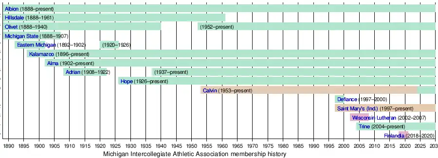 The Michigan Intercollegiate Athletic Association (MIAA) is an intercollegiate athletic conference that competes in the NCAA's Division III. There are nine teams in the conference, all located in the states of Michigan and Indiana. The Michigan Intercollegiate Athletic Association was established on March 24, 1888, making it the oldest college athletic conference in the United States.[1] The current members of the MIAA include Adrian College, Albion College, Alma College, Calvin University, Hope College, Kalamazoo College, University of Olivet, Saint Mary's College of Notre Dame, Indiana, and Trine University, formerly known as Tri-State University. Albion and Olivet are the only charter members remaining in the conference. Former members include such colleges as Michigan State University, previously Michigan Agricultural College, (1888–1907), Eastern Michigan University, previously Michigan State Normal College, (1892–1926), Hillsdale College (1888–1961), and Defiance College (1997–2000).