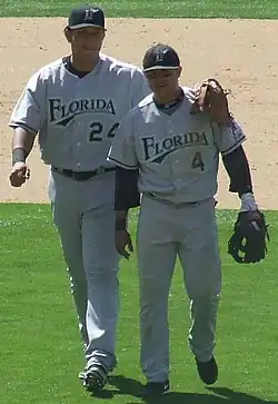 With teammates Josh Willingham and Dan Uggla hitting behind and ahead of him respectively, Cabrera finished the year with a .339 batting average, 26 home runs, and 114 RBIs.[2] He was selected for his third consecutive All-Star Game and won his second Silver Slugger Award.[16][17] Cabrera battled the Pittsburgh Pirates' shortstop Freddy Sanchez for the National League batting crown until the last day of the regular season. Marlins manager Joe Girardi decided to bat Cabrera leadoff for the final game of the season to give him more chances to get a hit for the crown.[18] He ended up finishing second to Sanchez. Cabrera also finished the 2006 campaign with a .568 slugging percentage and a .430 on-base percentage.[2]