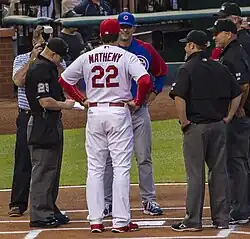 After defeating the Chicago Cubs 10–9 on May 4, 2015, the Cardinals had an MLB-best 19–6 record and the best 25-game start for the club since at least 1900.[37] The seven game win streak was a career-high for Matheny.[38] The Cardinals defeated the Cubs again the next game, 7–4, extending the win streak to eight.[39] A 3–1 victory over the Detroit Tigers on May 17, 2015, secured the 300th win of his managerial career.[40] In August 2015, Baseball America published that fellow NL managers and coaches rated Matheny the second-best manager in the league.[41] On September 19, the Cardinals became the first team in the majors to qualify for the playoffs. Matheny became the first manager in MLB history to guide his club to the postseason in each of his first four full seasons.[42][43] With an 11–1 win over the Pittsburgh Pirates on September 30, the Cardinals won 100 games for the first time in Matheny's managerial career, while clinching their third consecutive NL Central division title. The Pirates, who had kept close for most of the season, had already won 96 games, while clinching a wild card berth.[44][45] However, the Cubs, the second wild card team, defeated the Cardinals in the NLDS in four games.[46] Matheny finished second in the NL Manager of the Year Award voting,[47] and was a co-winner of the J. G. Taylor Spink St. Louis Baseball Man of the Year Award.[48]