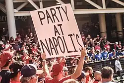 On January 5, 2016, Napoli signed a one-year, $7 million contract with the Cleveland Indians.[23] During the season, Streetsboro, Ohio resident Nate Crowe coined the popular phrase "Party at Napoli's", creating a t-shirt with the slogan that was gifted to Napoli. Upon wearing the shirt during a post-game interview, demand for the shirts was high. Subsequent sales of the shirt raised over $200,000 for the Cleveland Clinic Children's Hospital.[24] Napoli batted .239 while setting career highs with 34 home runs and 101 RBIs.[25] He finished second in the AL in strikeouts, with 194—the most strikeouts ever, by an Indians player.[1][26] Napoli led all AL first basemen in errors, with 13, in 98 games at first base.[1]