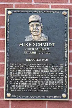 Michael Jack Schmidt (born September 27, 1949) is an American former professional baseball third baseman who spent his entire 18-year Major League Baseball (MLB) career with the Philadelphia Phillies from 1972 to 1989.[1] Schmidt was a 12-time All-Star and a three-time winner of the National League (NL) Most Valuable Player award (MVP), and he was known for his combination of power hitting and strong defense. As a hitter, he compiled 548 home runs and 1,595 runs batted in (RBIs), and led the NL in home runs eight times and in RBIs four times. As a fielder, Schmidt won the National League Gold Glove Award for third basemen ten times. Schmidt was elected to the Baseball Hall of Fame in 1995 in his first year of eligibility, and is widely considered to be one of the greatest third basemen in baseball history.[2][3]