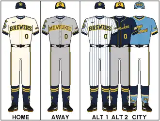 The set included a cream home uniform with "Brewers" and numbers in stylized block letters (a nod to Milwaukee's "Cream City" nickname), a home alternate pinstriped white uniform which shares the same features as the cream uniforms, a grey road uniform with "Milwaukee" and numbers in stylized block letters, and a road alternate navy uniform with "Milwaukee" in script letters and numbers in stylized block letters. The home sleeve patch features a navy baseball with stylized barley seams, while the road sleeve patch features the gold Wisconsin map with Cream City bricks and a baseball to represent Milwaukee's location. Initially, the gold-paneled navy cap was only used with the navy alternate uniform whereas the other uniforms were paired with the all-navy cap. However, beginning in 2022, the alternate gold-paneled cap was used exclusively on the road, with the all-navy cap worn only on home games. Both designs have the modernized "ball-in-glove" logo in front.[14]