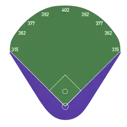 | Field size | Left Line – 315 ft (96 m) Left Field – 362 ft (110 m) Deep L.C. – 392 ft (119 m) Center F. – 402 ft (123 m) Deep R.C. – 392 ft (119 m) Right Field – 362 ft (110 m) Right Line – 315 ft (96 m) Backstop – 60 ft (18 m) ![]() |