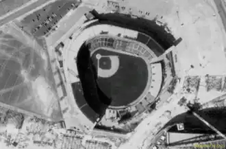 ![]() Aerial view of Milwaukee County Stadium in 2000 with Miller Park, now American Family Field, under construction in the lower right | |