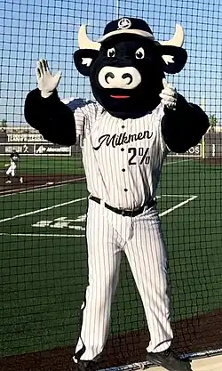 The Milkmen’s official mascot is an anthropomorphic black bull named “Bo Vine.”[19] He wears a white pinstriped uniform with the number 2% in reference to 2% milk. Bo Vine's name is based on the word “bovine,” pertaining to cattle. He is also known by some as his colloquial name, "Stevie Melter".