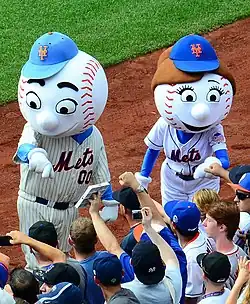 Mr. Met is the official mascot for Major League Baseball's New York Mets. Mr. Met first appeared in 1963 as a cartoon drawing in programs. When the team moved to Shea Stadium the following year, he came to life in the form of a costumed mascot—he is believed to be the first Major League Baseball mascot to appear in human form.[1]