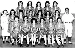 Front row, L-R: Alva Jo Fischer, Dorothy Maguire, Elizabeth Wicken, Charlene Pryer, Miss Hack, Erma Bergmann. Second row, L-R: Eunice Kessler (chaperone), Sara Reeser, Pauline Martin, Donna Cook, Arleene Johnson, Dorothy Montgomery, Josephine Lenard, Buzz Boyle (manager). Back row, L-R: Lavina Keough, Mary Rini, Amy Applegren, Joanne Overleese, Margaret Wenzell.