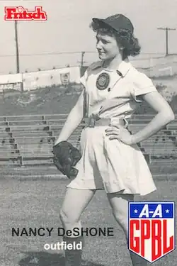 Nancy DeShone [Rockwell / Dinehart] (March 22, 1932 – October 6, 2007) was an All-American Girls Professional Baseball League player. Listed at 5' 3", 120 lb., she batted and threw left handed.[1][2]