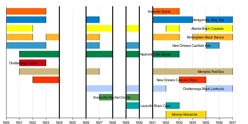 • 1923Dropped: Knoxville Giants, Louisville Stars, Montgomery Grey Sox and Chattanooga Tigers; Added: Birmingham Black Barons.