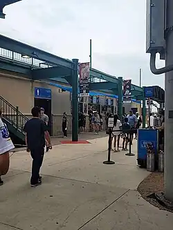 Viewing the stadium from the outside entrance (behind home plate) there are two large brick bell towers, in keeping with a southwestern theme, and echoing an architectural feature of the old Mission Stadium. Shaded seating in the stadium can be found in the Infield Reserved section 200–208 in the back 6 rows. There are no poles to impede views as seen in some older minor league parks. A concourse wraps around the playing field and provides spectators varied views of the game and stadium.