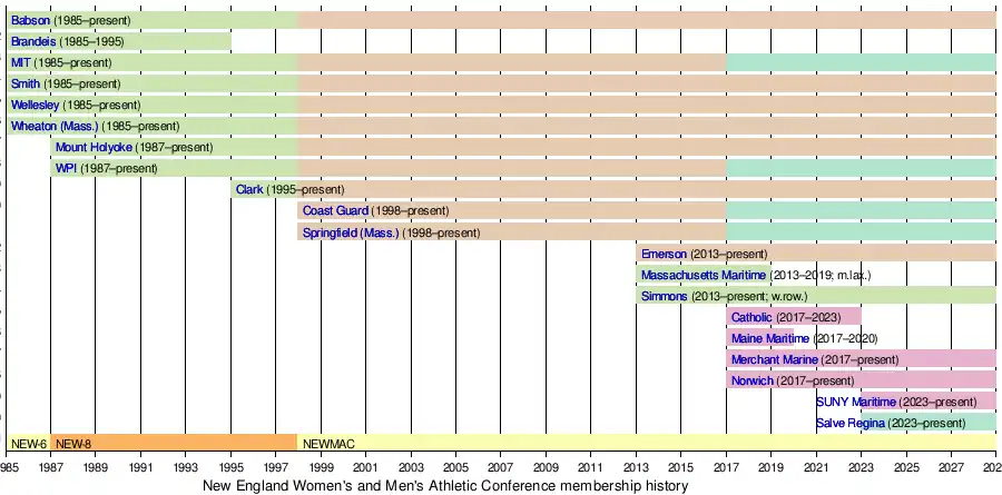 The NEW 8 began play in 1985-86 as the New England Women's 6 Conference (NEW 6). Charter members were Babson College, Brandeis University, Massachusetts Institute of Technology (MIT), Smith College, Wellesley College and Wheaton College. Mount Holyoke College and Worcester Polytechnic Institute (WPI) joined in 1988 and the name was changed to the NEW 8 Conference. At the conclusion of the 1994โ95 academic year, Brandeis University withdrew from the NEW 8 to join the University Athletic Association (where its men's sports competed at that time) and Clark University accepted membership, keeping the NEW 8's membership at eight institutions.[1]