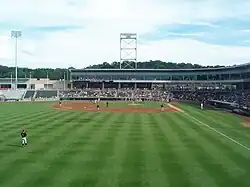 The New York Boulders' stadium is Clover Stadium. It was originally known as Provident Bank Park then as Palisades Credit Union Park and contains 9,362 seats, 16 luxury and 11 loge boxes. The dimensions of the playing field are 323 feet down the left-field line, 313 feet down the right-field line, power alleys of 383 feet, and 403 feet at centerfield. The park also includes a 34-foot x 52-foot scoreboard, as well as a 75-foot ribbon sign board. Other features include special hearing-impaired seating with loudspeakers installed under each seat, a children's playground, and community rooms. The park also contains an indoor batting cage used by players to warm up prior to games which is open to the public during the game.