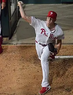In 2016, he was 11–6 (his 11 wins were 3rd in the league) with a 3.41 ERA (6th) and 111 strikeouts (6th) for the Double-A Reading Phillies, with whom Pivetta was an Eastern League mid-season All Star.[5] He was also 1–2 with a 2.55 ERA and 27 strikeouts in 24.2 innings in five starts for the Triple-A Lehigh Valley IronPigs.[13] The Phillies added him to their 40-man roster after the 2016 season.[14]