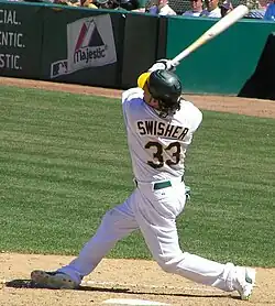 Nicholas Thompson Swisher (born November 25, 1980) is an American former professional baseball outfielder and first baseman in Major League Baseball (MLB). He was a switch hitter who threw left-handed, and played for the Oakland Athletics, Chicago White Sox, New York Yankees, Cleveland Indians and Atlanta Braves. He won the 2009 World Series with the Yankees and was an All-Star in 2010. A power hitter with excellent plate discipline, Swisher hit at least 20 home runs in each of nine consecutive seasons from 2005 to 2013, and reached 75 bases on balls on seven occasions in that span.
