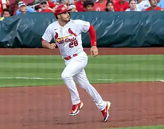 Arenado hit his first home run as a Cardinal on March 29 at Great American Ball Park in a 9–6 loss to the Cincinnati Reds.[97] He hit his first home run at Busch Stadium as a Cardinal in the team's home opener on April 8, a go-ahead two-run homer in a game in which the Cardinals won 3–1 over the Milwaukee Brewers.[98] Arenado was named the National League's starting third baseman at the 2021 Major League Baseball All-Star Game in Denver.[99] Arenado finished the 2021 season batting .255/.312/.494 with 34 home runs and 105 RBIs.[100] Defensively, he led National League third basemen in putouts (125), double plays (38), and range factor per game (2.66).[101] He won the Gold Glove Award at third base, one of five Cardinals to win that year, an MLB record.[102] His ninth consecutive Gold Glove tied him with Mike Schmidt for the most consecutive awards by a National League third baseman.[103] After the season, Arenado could have opted out of his contract with the Cardinals and become a free agent, but chose to remain with the club.[104]