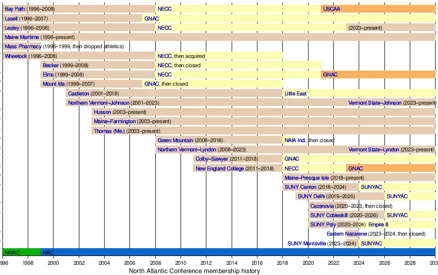 - Green Mountain College and Lyndon State College (later Northern Vermont University at Lyndon and now Vermont State University at Lyndon) joined the NAC in the 2008–09 academic year.