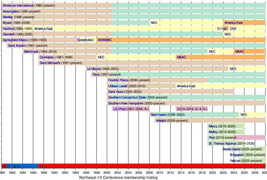 The “Northeast 10” name came about in 1987 when Saint Michael's College and Quinnipiac College joined the league.[1] The conference remained stable until 1995 when Springfield College left for Division III. The league stayed at ten members as Le Moyne College joined the league in 1996 from the New England Collegiate Conference (NECC) and briefly expanded to eleven when Pace University joined in 1997 from the New York Collegiate Athletic Conference (NYCAC). Quinnipiac moved to the Division I Northeast Conference (NEC) to again return the membership to ten.