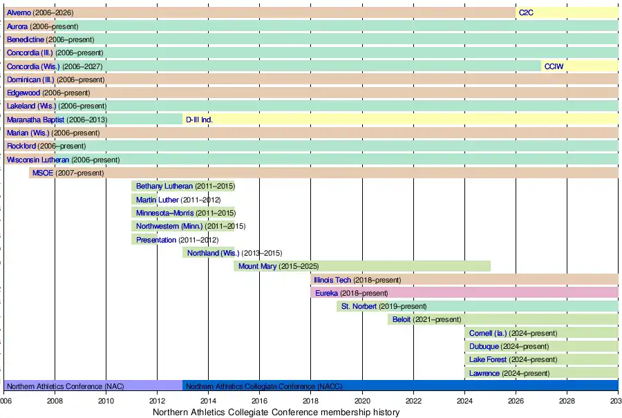 Just three changes to the league's core membership have occurred, as the Milwaukee School of Engineering joined the NAC in the fall of 2007, and Maranatha withdrew from the league in the summer of 2013.[3] In 2017, the Illinois Institute of Technology announced that they would be joining the NACC for the 2018 athletic season, coinciding with their acceptance as a full NCAA Division III member.[4]