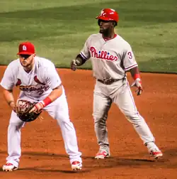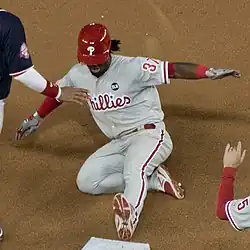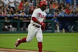 During spring training, the Phillies experimented with placing Herrera in center field, pushing Ben Revere to left field in the process.[18] Revere's defensive underperformance in spring training, as well as an injury to Domonic Brown, led Herrera to making the Phillies' opening day lineup in center field.[19] He made his major league debut on April 6, 2015, joining Freddy Galvis as the second Phillies rookie since 1970 to make his MLB debut on opening day.[20] His first major league hit came on April 12, with a walk-off RBI double in the 10th inning of a game against the Washington Nationals.[21] On May 12, after striking out 14 times in his last 24 at bats, Herrera hit his first career home run off of closer Mark Melancon in the Phillies' 4–3 loss to the Pittsburgh Pirates.[22] On July 25, Herrera made two late-inning diving catches to preserve Cole Hamels' no-hitter against the Chicago Cubs: once in the eighth inning against catcher David Ross, and again in the ninth, against third baseman Kris Bryant.[23] Herrera also came within one game of tying Bryant's 14-game hitting streak, the longest of any National League (NL) rookie in 2015, before he went 0-for-4 in a 13–1 loss to the Arizona Diamondbacks.[24] At the end of the year, the Phillies nominated Herrera for the Hank Aaron Award, given by fans and Hall of Fame members to the best offensive performer in each League. Herrera finished his rookie season leading the Phillies in batting (.297), runs scored (64), and doubles (30). He was also the first Phillies rookie to record 30 or more doubles in a season since Scott Rolen in 1997.[25]